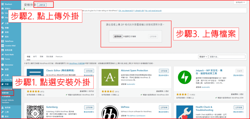 先下載好外掛,然後再將檔案如圖中的步驟上傳上去就好了。