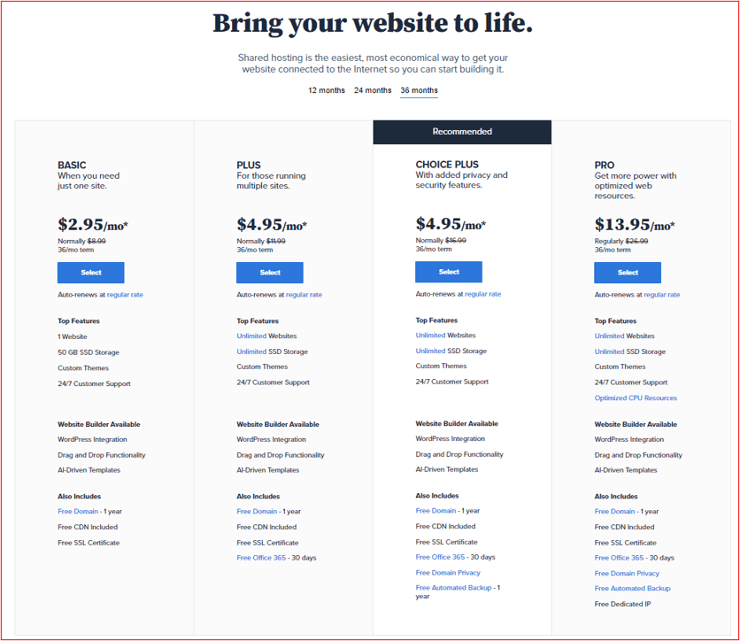 好!讓我們正式進入正題,當進入bluehost的官網點擊完‟Get Started“後會出現四個方案,而這四個分別差在哪邊,該怎麼選呢?
