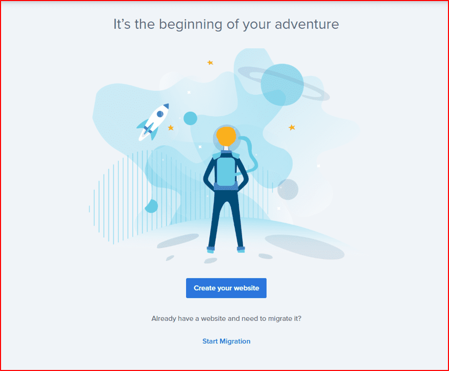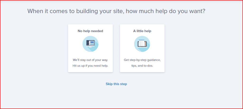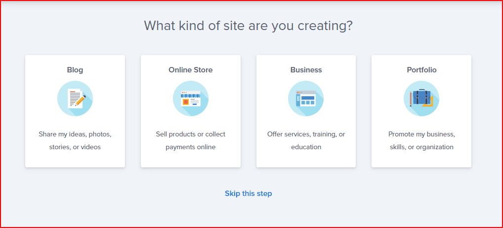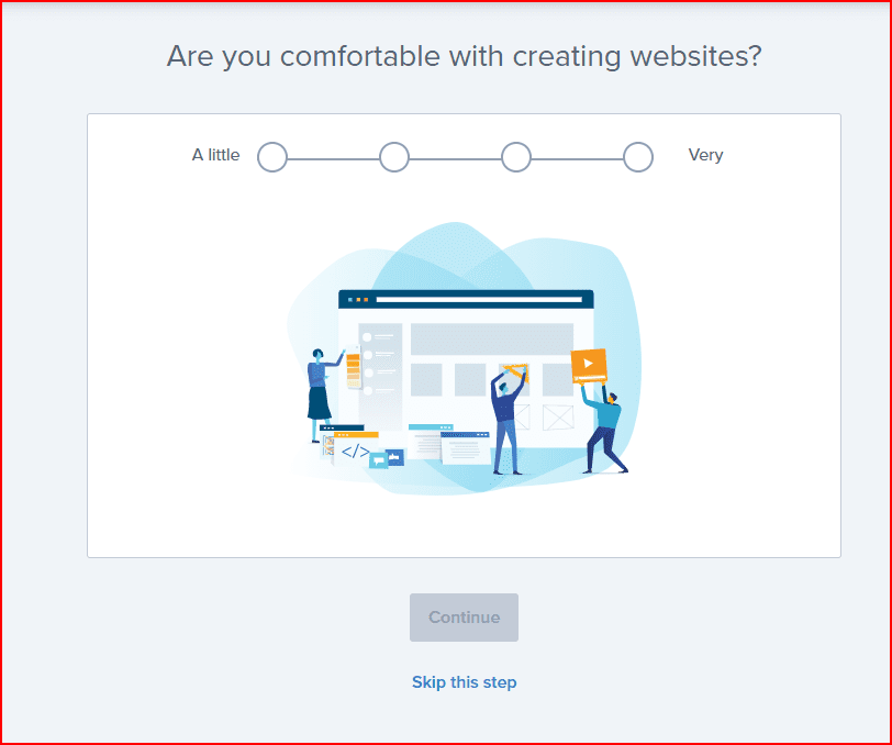 創建完帳號後,現在就是要來Create your website(創建你的網站)了,bluehost這邊會先問你幾個關於網站的問題,你可以照著它的步驟慢慢點選,或是也可以直接全部都按Skip this step來跳過,那些最後都可以在自己設定,所以不用太急或擔心點錯怎麼辦。 快速跳過點選這👇