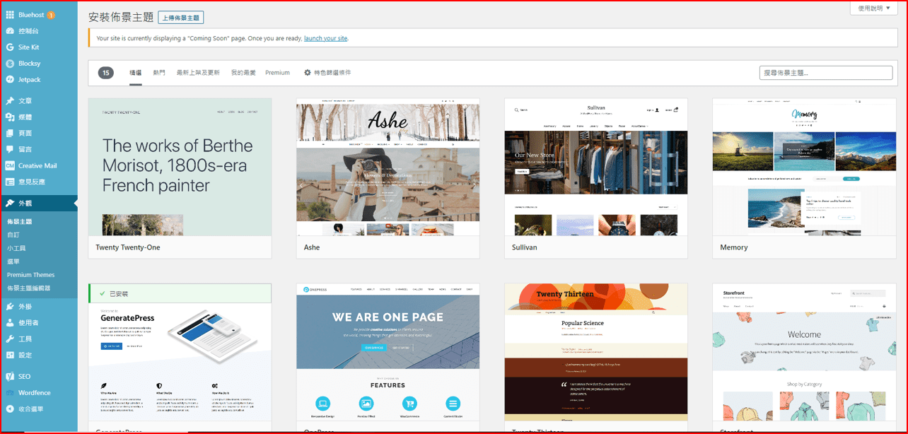 點選外觀➡佈景主題➡安裝佈景主題後,就可以開始挑選喜歡的樣式