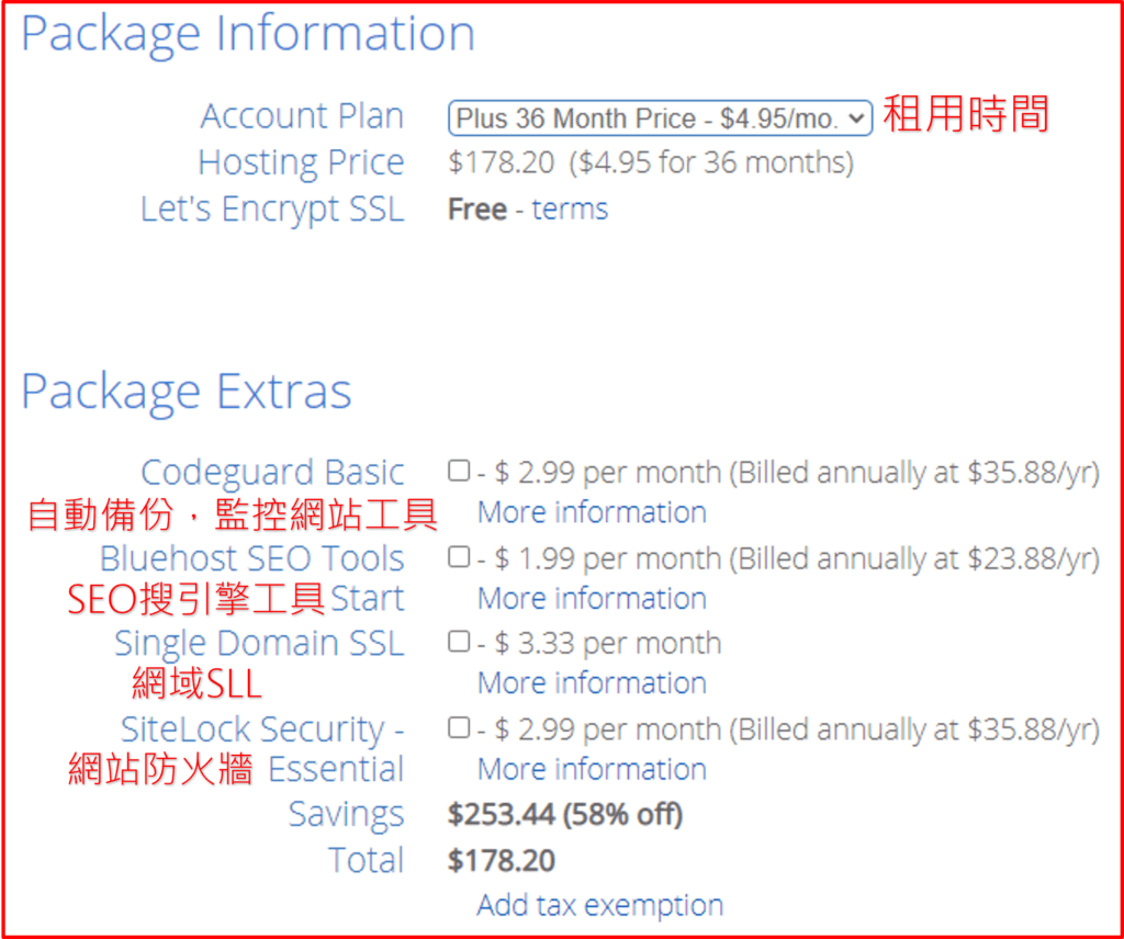 下面那四個可以都不用選,之後透過安裝免費插件就可以了,除非你真的預算夠願意支付那每個月的額外開銷就可以點選沒關係。