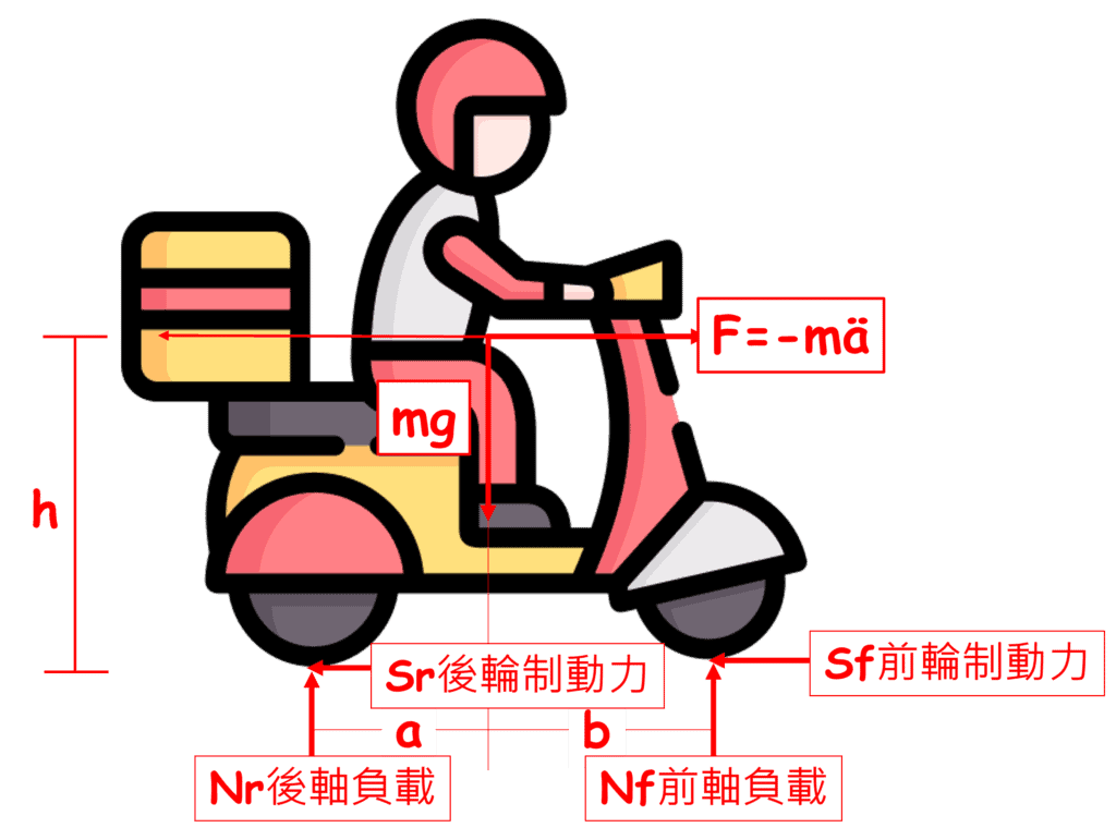 m代表總體質量,g重力加速度,a、b代表重心和前後軸之間距離,Nf 、Nr代表前後軸負載,Sf、Sr代表前後輪制動力,h代表重心高度。