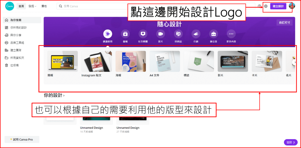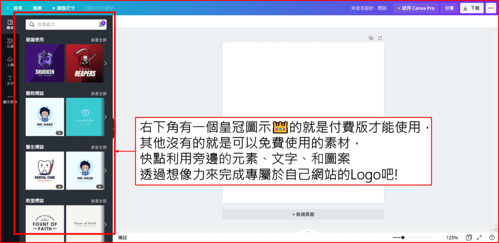 利用免費網站Canva來設計自己的網站Logo Canva可以做什麼呢? 相信大家都對這強大的Canva設計網站不陌生吧,即使要付費版才能全部解放它的功能,但是對於一般人來說免費版的功能已經非常充足使用了,看是要設計Logo、簡報、封面、小卡片….等等,它裡面都可以做到,所以不管什麼都很適合用它來設計(畢竟免費又很好上手😆)。下面的圖片會告訴大家基本的操作方法 看完後就趕快去實際應用看看吧 (/◕ヮ◕)/