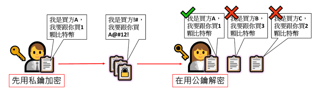 當產生一筆交易訊息時,首先會透過哈希運算(sha256)得出一個摘要,在透過私鑰進行加密得到一組密碼。