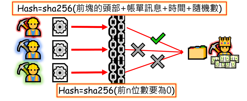 挖礦「mining」:透過工作量證明(打包),利用電腦解數學題目(哈希函數-sha256),一旦成功解出就可以獲得打包獎勵。