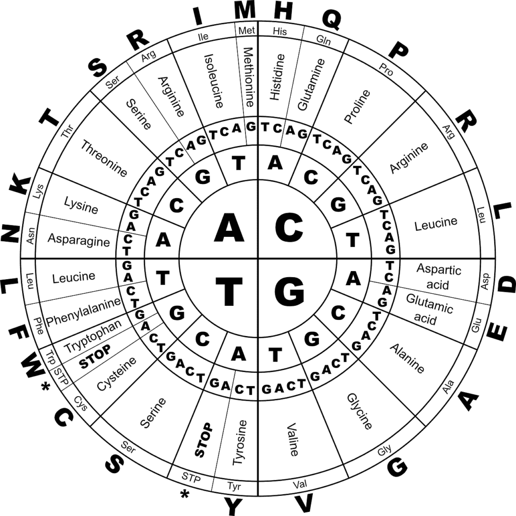 基因表現:首先,細胞核中會製造出傳訊核醣核酸(messenger RNA,mRNA),他是一個單股的一串字母組成,可以和與他抄寫的DNA序列相匹配(T為U取代)接著,mRNA會送到細胞核外的核糖體(蛋白質的合成工廠),將RNA的四個字母(A、G、C、U)轉譯為構成蛋白質語言中的20個小字母(20個胺基酸)。