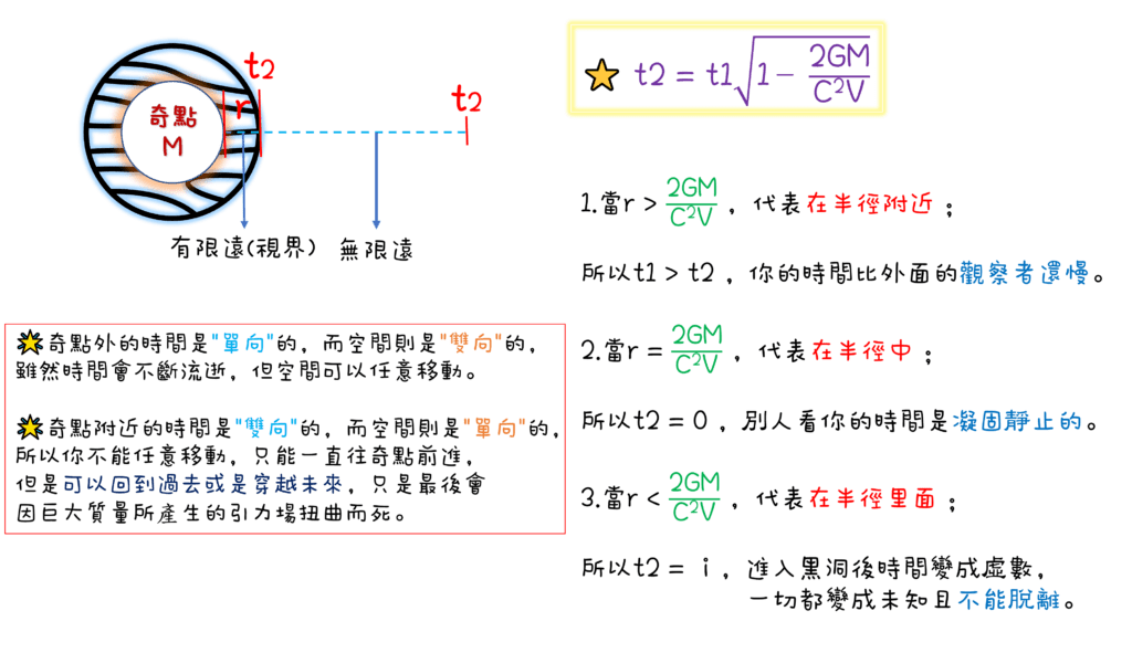 又稱為史瓦西黑洞,需要一個質量非常大的物質,因質量大等於能量大,而能量大又等於引力大,所以巨大的重力就會將周圍的時空彎曲,產生”時空互換”現象。(有看過星際效應的人應該都不陌生吧,下圖有比較詳細的講解😉)