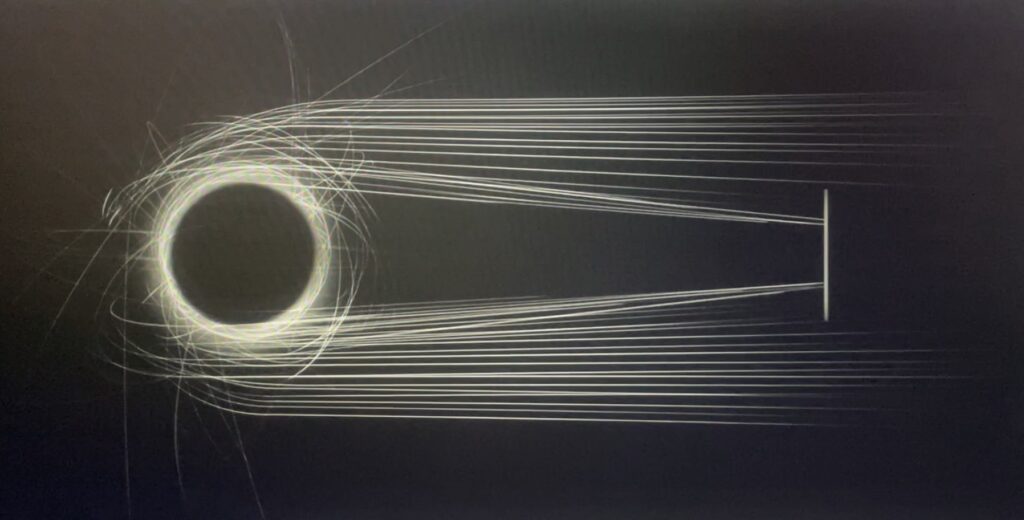 當一個光源發出的光在重力場附近經過時(如下面第一張圖),光線會像透鏡一樣發生彎曲,而光線彎曲的程度取決於重力場的強度(彎曲後得光線就會看起來像第二張圖那樣)所以可透過分析光線的彎曲來研究重力場的性質。(所以光不是都直進性的,當遇到重力場時他就會彎曲了!🤓!)