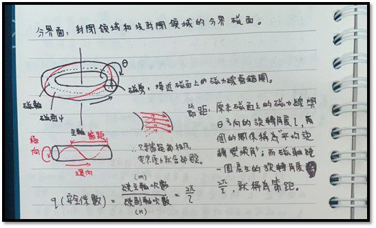 節距:原本磁面上的磁力線與θ方向的旋轉角度,兩者的關係稱為”平均旋轉變換角”,而磁軸繞一圈產生的旋轉角度就稱為節距,只要節距都相同,電漿壓力就會都固定。
