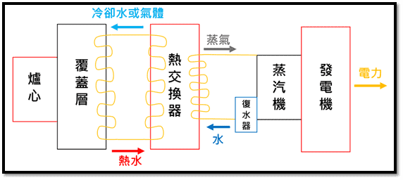 而這個就是他大致的構造,由外部加熱裝置和反應爐與場外輸出電力裝置所組成。