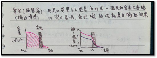 基架(隔離層、輸送障壁):他是由電漿自己隨意所形成一溫度和密度不連續的變化區域,會妨礙熱流動產生隔離效果。
