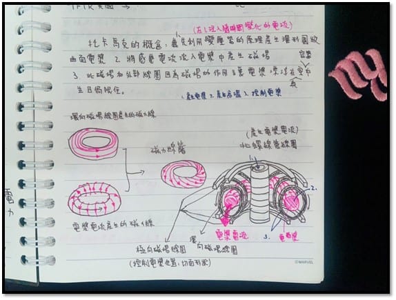 托卡馬克是前蘇聯所發現環形圓紋曲面型磁力電漿侷限裝置,其概念為:
