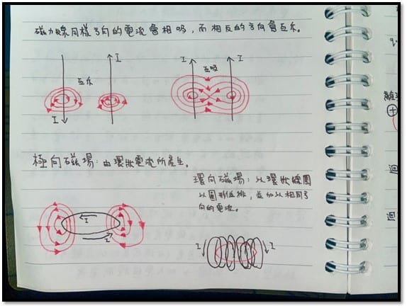 筆記本上畫的圖太醜先抱歉一下哈哈😂😂😂,但應該還是看得懂的吧~~~,接下來給大家看一下電流方向的不同會產生不同的磁力線。