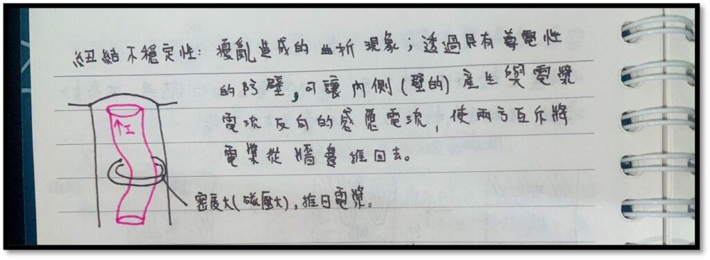 扭結不穩定性:擾亂造成的曲折現象,透過具有導電性的防壁,可讓內側壁產生與電漿電流反向的感應電流,使兩方互斥漿電漿從牆邊推回去。