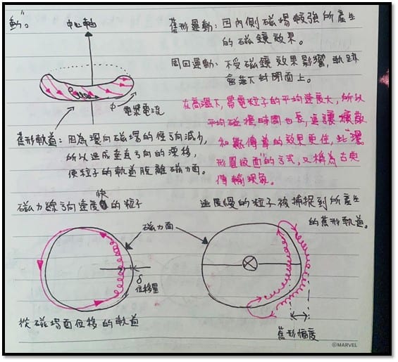 磁鏡場:當帶電粒子碰到強磁場時,其垂直方向的動能就會增加,平行方向的動能就會減少,一旦平行方向的動能為零時就會開始倒退(反射)。