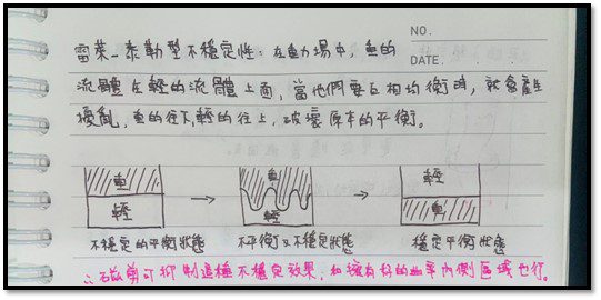 雷萊-泰勒型不穩定性:在重力場中,重的流體在輕的流體上面,當他們要互相均衡時,就換產生擾亂,重的往下,輕的往上,碰壞原本的平衡。