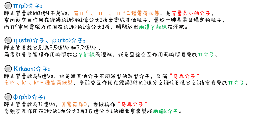 介子就是原子核中,核子互相轉換的媒介,他也一樣有許多不同的種類: