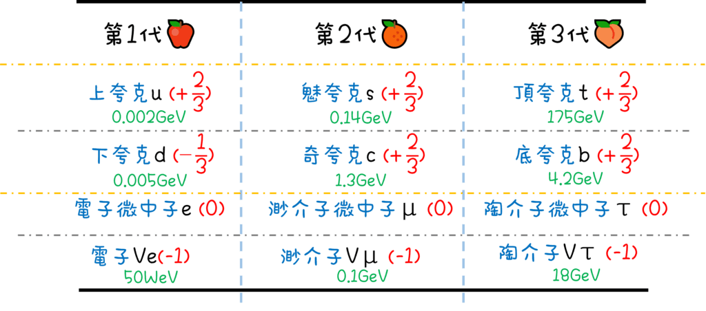 目前認知為物質是由夸克和輕子所組成,且只有第一代的粒子構成是現存的原子和粒子,其他都不存在,只能人工產出,各輕子會因弱交互作用而衰變成其微中子,但是不會跨世代衰變。