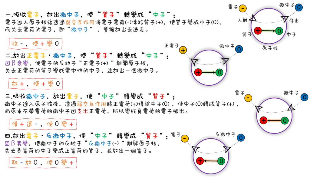 就是放射性原子核放出電子和微中子,以及電子轉換成微中子的作用,而傳遞此作用的粒子為“弱玻色子”,其質量是質子的100倍左右,因為太重了,所以移動距離也非常短,大約0.2公分的千兆分之一左右而已。