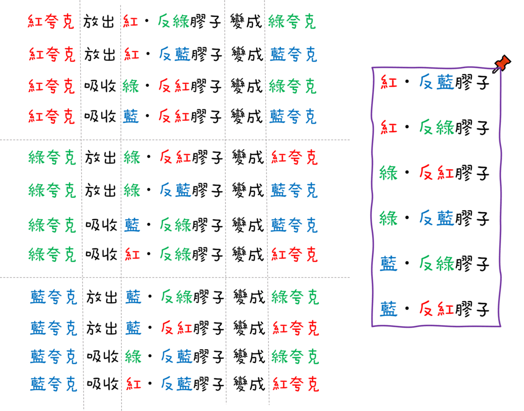 在微觀世界下,核子和夸克的自旋大小都為1/2,右旋為+,左旋為–,但依據“包力不相容原理(Pauli Exclusion Principle)”,電荷和自旋方向相同的粒子是不能同時存在於相同的場所,所以才會有u、d、s;反u、反d、反s(六味)和紅、綠、藍(三色)的存在(三原色調和會變成”無色”),其六味與三色都只是用來區別不同的狀態而已,沒有實質的意思。