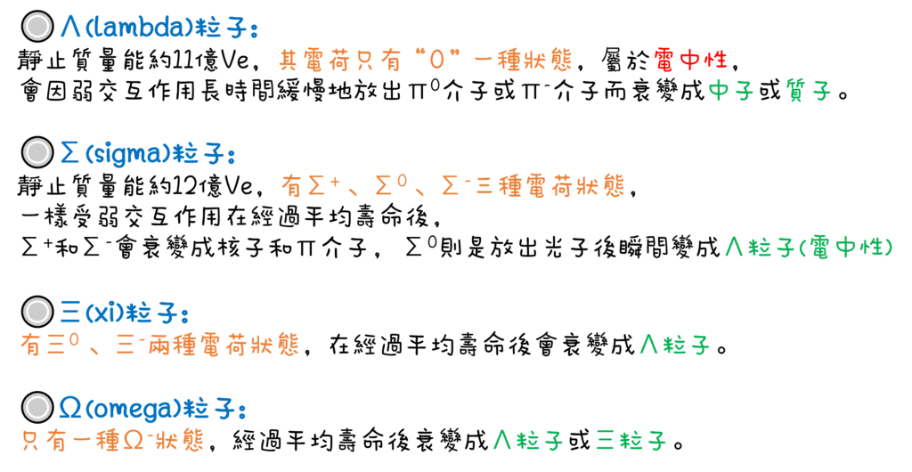 【超子(Ω👉Ξ👉Σ👉Λ);奇異介子(φ👉К👉η、ρ)】,直到最後都變成π介子再慢慢轉換成核子,或是變成γ射線而湮滅,平均壽命為一秒的一百億分之一。