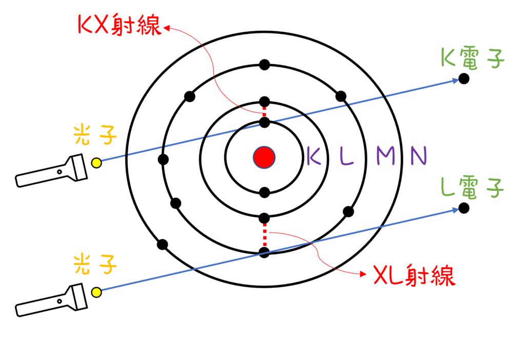 使用特定能量的光子去撞擊原子內某軌道時,只要外側軌道仍有空位,則電子會吸收光子“躍遷”到外側的軌道繞轉,然後會在放出光子返回內側的軌道,此時釋放出來的光會根據不同殼層(K、L、M、N)會被稱為KX、LX、MX、NX的特徵射線,因為各軌道能量是固定不變的,所以射線能量就相當於一開始被電子吸收的光子能量。